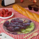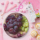 Cluster aus roten und grünen Trauben. Tropfen Wasser auf die Beeren. Texturierte Fotografie, grün und lila Farben. Drucke und Geschenke für Spaß und gute Laune.