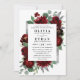 Die Einrichtung besteht aus Aquarellpeony und Rose Blumenelementen in Rot- und Bordeauxtönen über eukalyptus botanischer Vegetation. Die Vorlage verfügt auch über eine bedruckte, silber oder grau gefärbte Box für ein elegantes Layout. Die Typografie zeigt ein modernes Layout mit schwarzem Text. Sehen Sie sich den Link zur Sammlung auf dieser Seite an, um passende Produkte im Hochzeitsfest-Set zu finden.