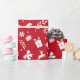 Ein rotes Verpackungspapier mit einem weißen Weihnachtsmuster, mit Weihnachtsbäumen, Rentieren, Geschenken, Schneeflocken, Sternen, Bögen, Schaukelpferden, Schlitten, heiligen Blätter, Glocken, Ästen und Weihnachtsmannmützen.