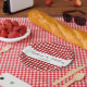 Rot und Weiß Gingham Muster Grillen Hochzeitspapier Teller. Zwei Farbtöne mit roten Streifen.