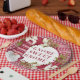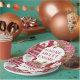 Mit diesen niedlichen Aquarellpapier-Tellern in Aquarellfarben mit einem rot-weiß-nordischen Gnome mit dem Text "gnome sweet gnome" erleben Sie den Urlaubssinn. Der Hintergrund hat ein rot-weißes, faires Inselmuster.