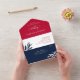 Feiern Sie Ihren besonderen Tag stilvoll mit dieser raffinierten, Öko-freundlichen All-in-One Hochzeitseinladung. Diese Einladung ist in einer atemberaubenden, dreistöckigen Farbpalette aus Rot, Weiß und Blau gehalten und bietet eine reiche, moderne Ästhetik, die das Wesen der Eleganz und Einfachheit erfasst. Jeder Bereich ist sorgfältig in einem anderen reichen Ton entworfen, wodurch ein nahtloser und schöner Fluss von der Einladung zur UAWG entsteht. Die zarten Imitate Silber und Blau-Folie Blätter verleihen Ihrer Hochzeit eine Touch Raffinesse und zeigen Ihre Hochzeitsdetails mit dezenter Eleganz. Diese Einladung ist für das moderne Paar gedacht, das sowohl Schönheit als auch Praxisnähe schätzt und alles bietet, was man braucht, in einem schlichten, leicht zu versendenden Teil. Ohne zusätzliche Einsteckkarten, RSVP-Karten oder Umschläge ist dies der ultimative Luxus - umweltfreundlich und bequem. Umfasst die Hochzeitsfeier und die Einzelheiten zum Empfang sowie eine perforierte UAWG-Postkarte, die den Gästen zum Ausfüllen und Zurückgeben zur Verfügung steht. Option, auf der Rückseite Gästennamen für eine vollständig adressierte Einladung hinzuzufügen, die zum Versenden bereit ist. (Alternativ können Sie den Namen und die Adresse löschen, um traditionelle Umschläge zu verwenden.) Diese moderne, minimalistische Einladung verbindet Funktionalität mit Schönheit - eine ideale Wahl für das Öko-bewusste, stilvolle Ehepaar, das eine Erklärung abgeben und dabei Dinge einfach und nachhaltig behalte. Ideal für Rot, Weiß und Blau Hochzeiten: Ideal für Patrioten oder Paare, die eine raffinierte, kühn gestaltete Farbpalette Liebe haben. Die Koordination Save the Date ist auch bei Zazzle möglich.