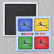 Dieser Magnet zeigt vier farbenfrohe Symbole (rot, gelb, grün, blau) mit einer Rudermaschine in der Silhouette. Der Titel lautet "ROWING TO WIN", und WIN wird zweimal rot ausgelesen.