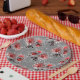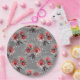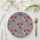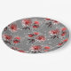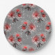 Rote Blume auf grauem Hintergrund mit weißen Polka-Punkten.