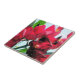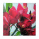 Das Originalfoto von MaeFlowers, das auf dieser farbenfrohen kleinen Keramik Tile zu sehen ist, ist eine Nahe von roten Blume in Blüte, mit ihren langen grünen Blätter vor einem hellblauen Himmelshintergrund. In der Nähe des Zentrums des Fotos ist eine der Blume vorbei an voller Blüte. Die Blütenblätter trocknen und kurbeln an den Rändern, was das gelbe, getippte Zentrum der Blume beleuchtet.