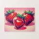 Entspannendes Puzzle - Rote Erdbeere mit Herz niedlich Zeichnend - Dieser schöne, lebendige Cartoon Stil ai generiert Image zeigt saftige rote Strawberries auf einem hellroten Hintergrund. Die Erdbeere im Vordergrund hat das rote Herz niedlich.
