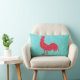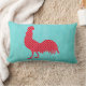Ein Rot, quatrefoil gemusterte Silhouette von einem Hahn ist auf einem Türkis farbigen Hintergrund mit einer hölzernen Kornbeschaffenheit. Die Rückseite des Kissens ist gerade das rote quatrefoil Muster.