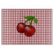 Stilvolles Glasschneidenbrett angetan in einem roten und weißen Ginghammuster, mit Grafiken zwei saftige rote Kirschen, in der Mitte. Fertigen Sie besonders an, um Text diesem hübschen Zusatz hinzuzufügen zu jeder möglicher Küche.
