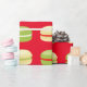 Dieses stilvolle FeiertagsAusrüstungsbeschreibungen französische macaron Plätzchen in den festlichen Farben von Grünem und von weißem, mit rotem Zuckergusse. Der Hintergrund ist ein tiefes Weihnachtsrot. Eine sehr schicke und Pariser Weise, Weihnachten zu feiern!