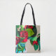 Tote Tasche mit schönem Blumendesign aus einem originalen Aquarellmalereien aus roten Kamelien-Blume mit grünem Blattwerk der Künstlerin Sacha Grossel. Diese Blume sind farbenfroh, lebendig und hell, und dieses bunte botanische Blumendesign würde als modisches Accessoire aussehen.