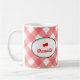 Kundenspezifische Kaffee-Tassen machen Ihren Brautjungfern praktische Geschenke. Diese personalisierte trinkende Tasse kennzeichnet einen Ginghammusterhintergrund mit individuellem Namen oder Text-Set innerhalb eines wulstigen ovalen Rahmens. Der Name wird mit Kirschen selbstverständlich überstiegen. Danken Sie Ihrem Brautparty mit diesen Chickaffee-Tassen.