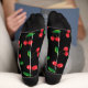 Gemusterte Socken aus feinem Obst, gemustert mit hellroten Kirschen auf schwarz