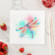 Rot, fliegend, künstlerisch gezeichnet, in hellen Farben mit texturiertem Schöpferdchen, blaue Flügel auf weißem Hintergrund, überstrichen mit Aquarellmalerei. Helle rote Libelle.