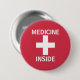 Rotes Medizin-Innere-Erste ERSTE HILFE Symbol-personalisierter Knopf. Wählen Sie von einer Vielzahl von Größen. Roter Hintergrund mit Text, der MEDIZIN NACH INNEN liest. Redigieren Sie, um zu den Medizinausrüstungen, zu den Hilfeausrüstungen oder zu den medizinischen Taschen zu personifizieren und zu befestigen. Entwürfe durch Lil Allergie befürwortet Hilfe