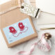 Ein niedliches Urlaubspaar mit einer roten Saite und einem Schneeflockendesign. Ein blauer Hintergrund mit weißen Schneeflocken.