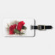 Die Rückseite dieses Gepäckanhängers lässt sich leicht anpassen. Auf einem perlenweißen, brokierten Stoffhintergrund befindet sich ein Set aus zwei glänzenden roten Nelken. Machen Sie Ihr Gepäck auf einem Carousel am Flughafen auffällig!