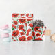 Papier in ein zartes Muster von lebhaften roten Pappeln mit tiefen grünen Stielen und Blätter, auf einer Weile Hintergrund, mit jedem Mohn blühen einzigartig gekrümmt und verdreht, als würde es sanft in der Brise schwingen.