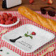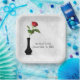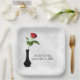 Rote Rose in Vase auf weißem Damast Pappteller