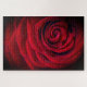 Dieses Blumenpuzzle zeichnet sich durch ein nahes Foto einer wunderschönen rote Rose aus, die mit Tau-Tröpfchen bedeckt ist.