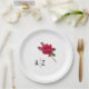Hochzeitspapier-Teller mit rote Rose-Design. Fügen Sie die ersten Buchstaben-Initialen des Paares in schwarzem, gedrucktem Text hinzu. Eine dünne, rote vertikale Linie teilt die Buchstaben. Wählen Sie runde oder quadratische Teller in der gewünschten Größe aus.