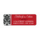 Diese schwarz-weiß-Damast-Rücksendeadressen-Aufkleber haben ein feuchtes Muster auf der links Seite mit dem roten Textbereich, das dem Set der Hochzeitseinladung entspricht. Ihr Name(e) und Ihre Rücksendeadresse sind in weißer Schrift mit einem verzierten schwarzen Bildlauf unterteilt.
