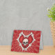 Ce carte pour notes est rouge avec des lignes blanches de type toile d'araignée avec un coeur éffrayant rouge cerné d'os avec un crâne au centre.