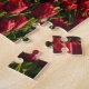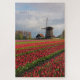 Vertikales Puzzle mit einer Frühjahrslandschaft mit einem Feld mit roten Tulpen und anderen Blume und einer Windmühle während des Sonnenaufgangs in den Gärten des Keukenhof, Bulb Region, Niederlande.