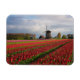 Rechteckiger Foto-Magnet mit einer Frühjahrslandschaft mit einem Feld mit roten Tulpen und anderen Blume und einer Windmühle beim Sonnenaufgang im Keukenhof Gärten, Bulb Region, Niederlande.