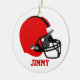 Runde Keramikverzierung mit Grafiken eines roten und schwarzen Fußballsturzhelms, auf dem vorderen und festen Rot, auf der Rückseite. Roter Text, auf der Front hat ein Namens und schwarzer Text auf der Rückseite liest Weihnachten 2012. Aller Text ist kundengerecht, damit Sie für selbst oder als große Geschenkidee zu diesem speziellen Fußballspieler auf Ihrer Liste personifizieren können. Nett hat einen Türaufhänger oder obenliegenden einen Fanzug.