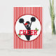 Spaß-Weihnachtsentwurf für die Cheerleader kennzeichnet einen roten und weißen Streifenhintergrund. Es gibt einen weißen Kreis in der Mitte mit roter Ordnung. Innerhalb des Weiß ist der Kreis eine schwarze Silhouette einer Cheerleader, die in die Luft mit ausgestreckten Armholding pom poms springt. Die Cheerleader trägt einen roten und weißen Weihnachtsmann-Hut. Über der Cheerleader ist das Wort BEIFALL im mutigen roten Jerseyart-Schriftart. Der Wort Beifall wird mit zwei Sprigs Stechpalme verziert. Innerhalb der Karte ist kundengerechter Text im gleichen Jerseyart-Schriftart im Schwarzen. Dieses ist die perfekte Weihnachtskarte für Trainer, Cheerleadern und Beifallfamilien!! Verbreiten Sie Feiertag BEIFALL!