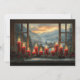 Weihnachtstag, schönes schneebedecktes Berg-Winter Zuhause, mit Blick auf den Sonnenuntergang aus einem Erkerfenster mit hell erleuchteten roten Weihnachtskerzen, Tannenzapfen und roten Beeren auf der Fensterbank.