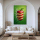 Ein lebendiges digitales Kunstwerk eines roten Apfels in schwimmende Segmente mit realistischen Wasserspritzen. Ideal für Küche, Essen oder moderne Wanddekoration.