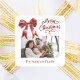 Weißer Hintergrund, roter Text und roter Bogen. Text und Foto. Frohe Weihnachten wird mit einem eleganten, handgeschriebenen Schriftart geschrieben.