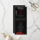 Ein roter Drache auf einem Schwert und rote Rosen vor dem Hintergrund eines schwarzen Hochzeitsprogramms