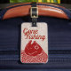 Gepäckanhänger mit einem roten Fischkopf und taupe Herringbone-Hintergrund.