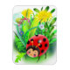 roter, niedlicher Ladybug auf Gras- und Blume-Hintergrund