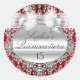 Sticker für Quinceanera. Roter Damast & Silberschmuckbogen. Exklusiv Zazzle. Passen Sie Ihre persönlichen Daten an. Bitte beachten Sie alle flachen Bilder! Sie haben KEIN echtes Silber, Bögen, Diamanten oder Juwelen!!