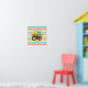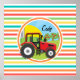 Cooler, niedlicher, roter Traktor mit grünem Feld auf farbigen roten, orangefarbenen, gelben, grünen, blauen, weißen Regenbogenstreifen. Personalisieren Sie dieses Kinder Bauer Thema Produkt mit Namen.