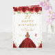 Diese elegante und glamouröse Geburtstagskarte kann mit einem Namen oder Titel wie Tochter, Enkelin, Nichte, Freundin usw. personalisiert werden. Das Design zeigt eine schöne Prinzessin mit blondem Haar und heller Haut in einem roten Ballkleid. Der Text kombiniert handgeschriebene Schrift und moderne serifenlose Schriften für ein klassisches und anspruchsvolles Aussehen. Die Blumenarrangements, Schmetterlinge und goldenes Konfetti schaffen die perfekte Mischung aus rustikal und chic.
