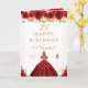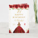 Diese elegante und glamouröse Geburtstagskarte kann mit einem Namen oder Titel wie Tochter, Enkelin, Nichte, Freundin usw. personalisiert werden. Das Design zeigt eine schöne Prinzessin mit blondem Haar und heller Haut in einem roten Ballkleid. Der Text kombiniert handgeschriebene Schrift und moderne serifenlose Schriften für ein klassisches und anspruchsvolles Aussehen. Die Blumenarrangements, Schmetterlinge und goldenes Konfetti schaffen die perfekte Mischung aus rustikal und chic.