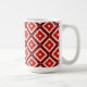 Ein nahtloses künstlerisches Muster mit geometrischen roten, orangen und beigen Formen, die miteinander verbundene Sternmotive bilden.