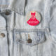 Elegantes grafisches Juniorbrautjungfernmädchen mit blasser Haut in einem roten Kleid, das einen Posy des stylized Rosen-Button-Knopf-Abzeichens hält. Liest Juniorbrautjungfer karminroten Mae oder personifiziert mit Ihren eigenen Mädchennamen. Groß für Brautpartys, wedding Proben oder Gastgeschenk Hochzeit hinzuzufügen bauscht sich.