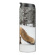Roter Fuchs mit buschigem Schwanz in kaltem Weißschnee. Hoher grüner Pinienwald im Hintergrund. Schöne Natur.