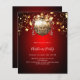 Eine Einladung für ein Weihnachtsfest. Ein roter Farbverlauf. Die Einrichtung ist mit einem großen goldfarbenen Vintagen, goldenen Sternenhimmel geschmückt. Personalisieren und fügen Sie die Details hinzu. Weißer Text. 1 Blatt = 1 Einladung mit Druckkante bis Kante.