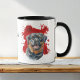 Ein wunderschönes Aquarellbild eines Rottweilers hebt sich vor einem abstrakten, leuchtend roten Spritzer-Hintergrund hervor. Das Bild befindet sich auf zwei Seiten der Tasse, mit Ihrem Namen oder einem anderen benutzerdefinierten Text in schwarz.