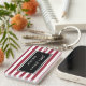 Annoncez vos qualifications en tant que coiffeur professionnel avec ce porte - clé horizontal large rouge et blanc à la mode de carte de visite de salon de coiffure de rayures avec un cadre noir contemporain. Personnalisez ce motif à la mode de rayure en ajoutant le nom du styliste en coiffure ou du coiffeur certifié. Tout le texte dans ce modèle de carte de visite peut être customisé avec votre profession ou affaires de choix.