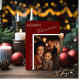 Rouge Avec Carte photo De Famille De Script Argent. Célébrez la saison avec cet élégant rouge avec une carte de Noël en argent, avec une photo de famille sur la droite. Le design est de style portrait et comprend la calligraphie script, avec une bordure rouge festive sur deux côtés de l'image avec le type rouge correspondant pour une touche joyeuse. Customisez la carte avec votre propre photo, les noms de famille, un message sincère, et l'année, ce qui en fait un accueil vraiment personnel de vacances.