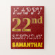 Cette conception amusante et simple de puzzle d'anniversaire comprend le message "HAPPY 22nd BIRTHDAY", avec le "22nd" ayant une apparence de couleur fausse/imitation or. Il porte également un nom customisé et un arrière - plan de couleur rouge. Ce pourrait être une façon amusante et spéciale de délivrer un message d'anniversaire personnalisé à quelqu'un qui célèbre son vingt-deuxième anniversaire. [~Z0000200]