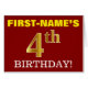Ce design de carte de voeux d’anniversaire comporte un message comme "FIRST-NAME’S 4th BIRTHDAY!", le "4th" ayant une apparence de couleur fausse/imitation or. Le nom du destinataire sur le devant peut être customisé, et l’arrière - plan avant est de couleur rouge. Il comporte également un message de voeux d'anniversaire personnalisable à l'intérieur. Une carte de voeux comme celle-ci pourrait peut-être être remise à quelqu'un pour célébrer son quatrième anniversaire. [~Z0000184]