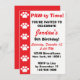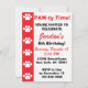 Cette invitation affiche une bande rouge avec des empreintes de pattes blancs et le texte "PAW-ty Time! Vous êtes invités à célébrer..." Il s'agit d'excellentes invitations à des soirées d'empreinte de patte, à thème pour chien, à thème pour chiots, à thème pour chat ou à thème pour animaux pour enfants.